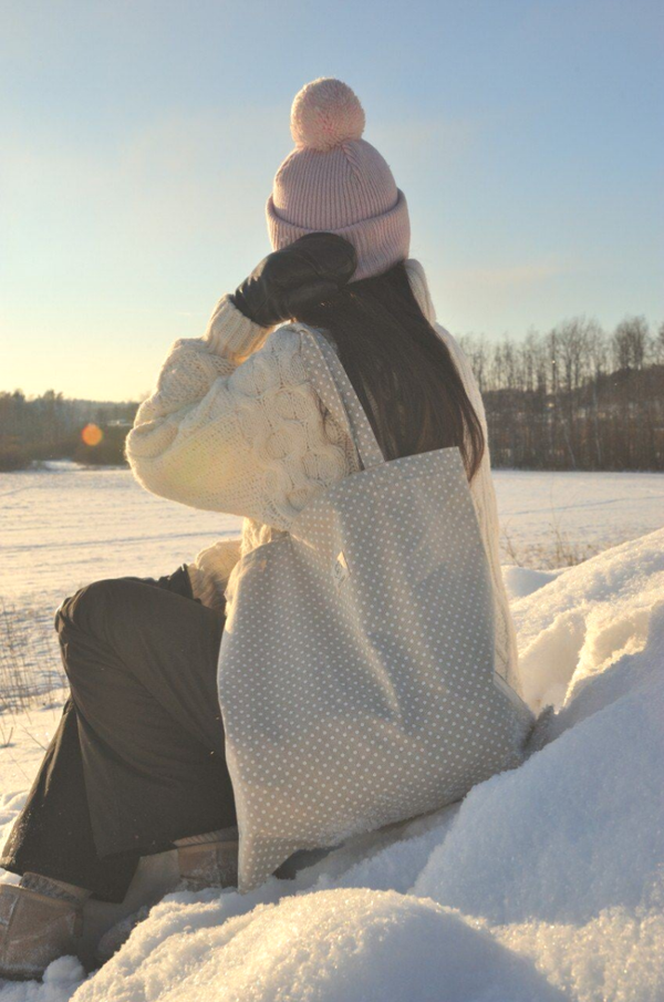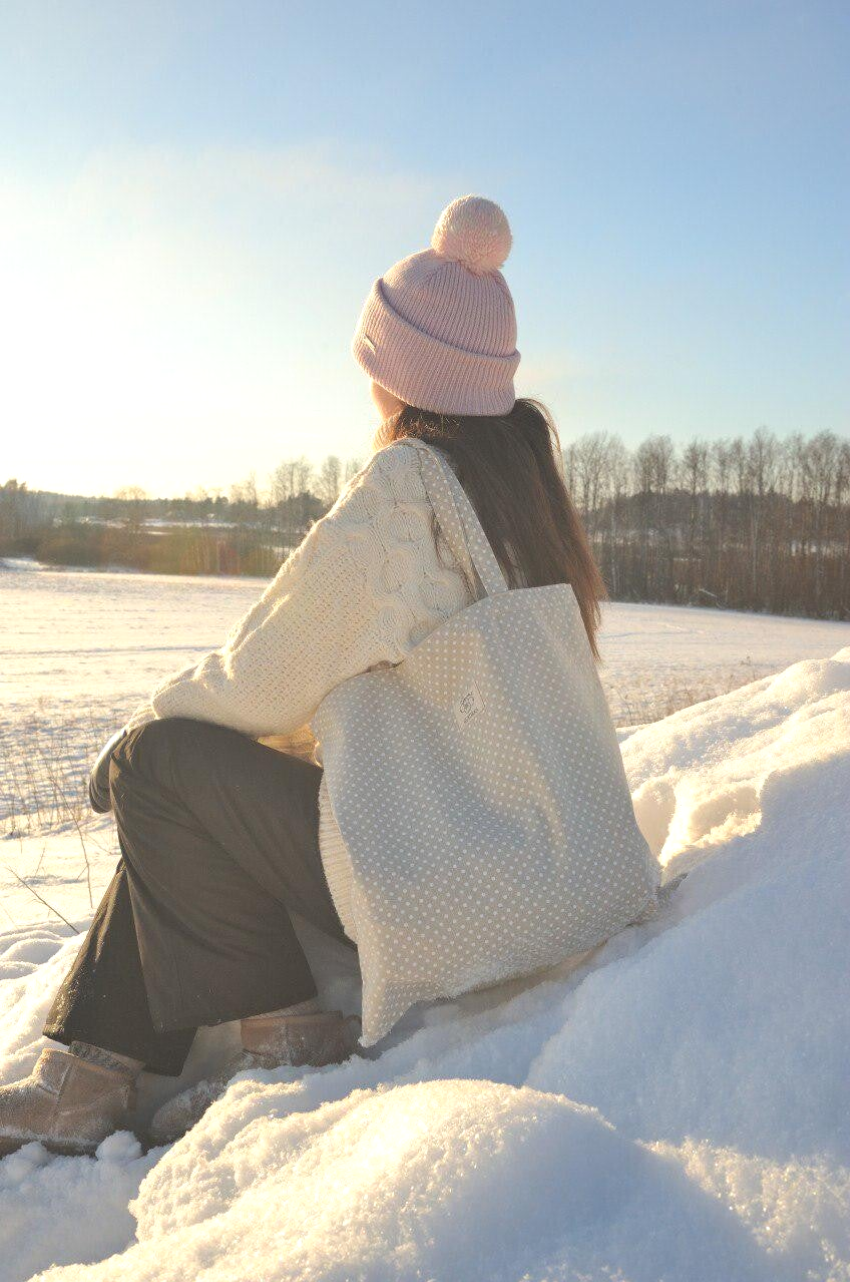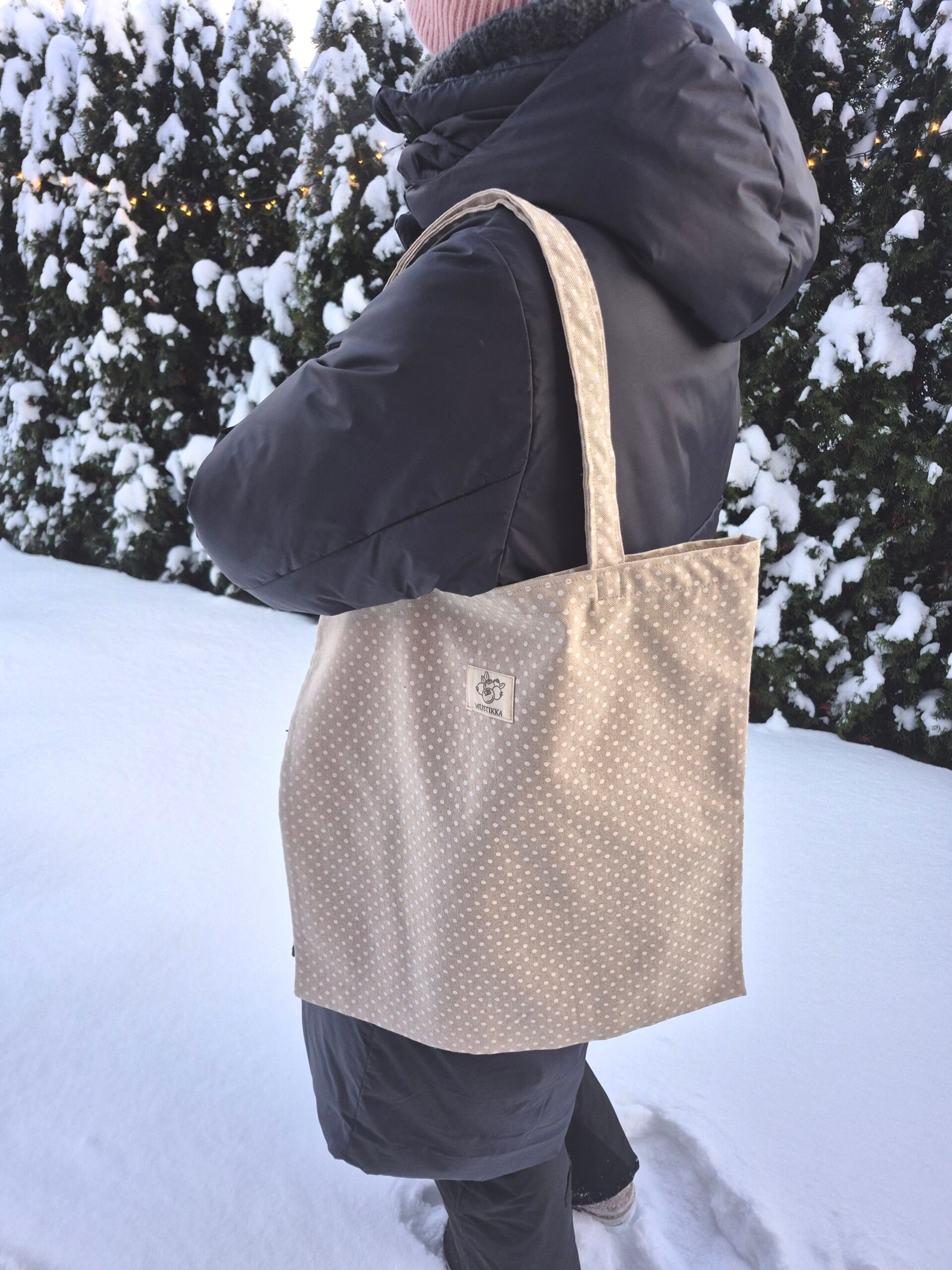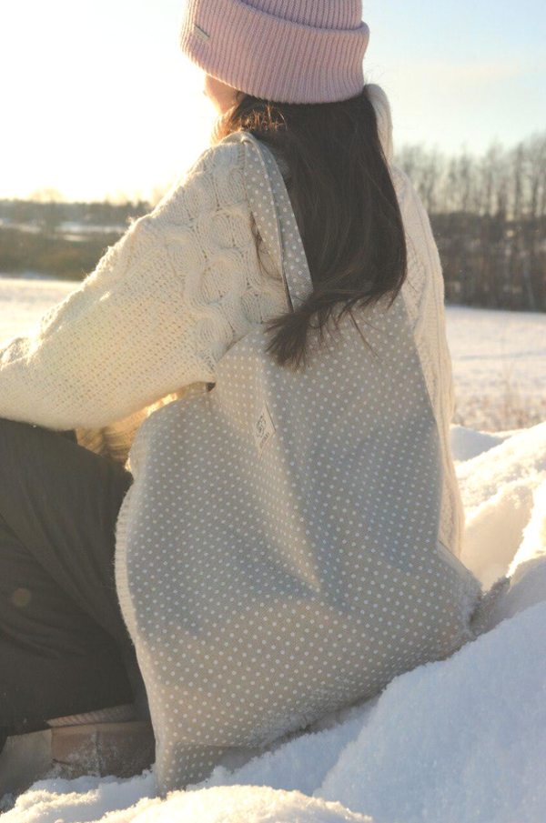 Ihanan pilkullinen beige kangaskassi